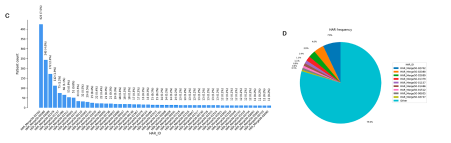 Рисунок 1. Геномный ландшафт пересечений CNV–HAR у пациентов с нарушениями ЦНС. С - Распределение частот в анализируемой группе для HARs, затронутых CNVs. D - Относительный вклад наиболее встречающихся HARs в общее количество пересечений CNV–HAR.