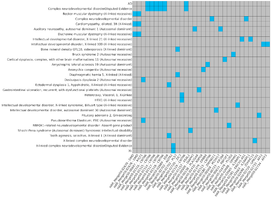 Используя методы биоинформатики, было проведено сравнение частот нарушений в HARs с данными международных баз (DGV, ClinGen). Результаты превзошли самые смелые ожидания: большинство найденных CNVs в HARs при патологии в здоровой популяции либо отсутствуют, либо крайне редки. Более того, часть HARs-ассоциированных генов связана с хорошо изученными наследственными заболеваниями. В частности, гены ZMYND11, CNTNAP2, RBFOX1, DMD, HTX1 и ряд X-сцепленных локусов, демонстрируют выраженную связь с синдромами умственной отсталости, нарушениями развития нервной системы, а также врожденными дисплазиями скелета и соединительной ткани.
