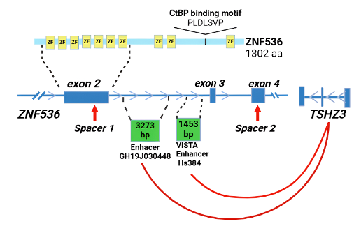 Рис. 1 Схема структуры гена ZNF536 и потенциальных энхансеров в интронной области